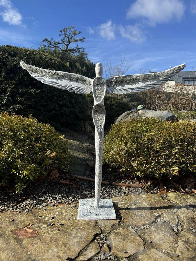 Anděl má roztažená křídla , která působí majestátně a elegantně, pomyslně objímá prostor a drží rovnováhu.