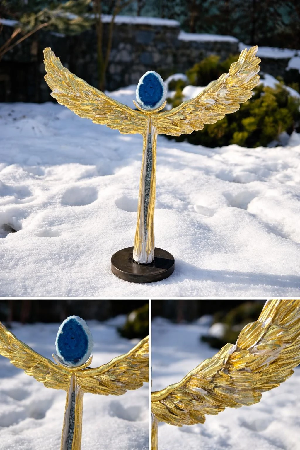 Anděl je celo-keramický, modelovaný s důrazem na detail a harmonii tvarů. Ve středu jeho těla jsou vložené modré kamínky, které symbolizují plynoucí proud hojnosti, klidnou energii a otevřenost přijímání.