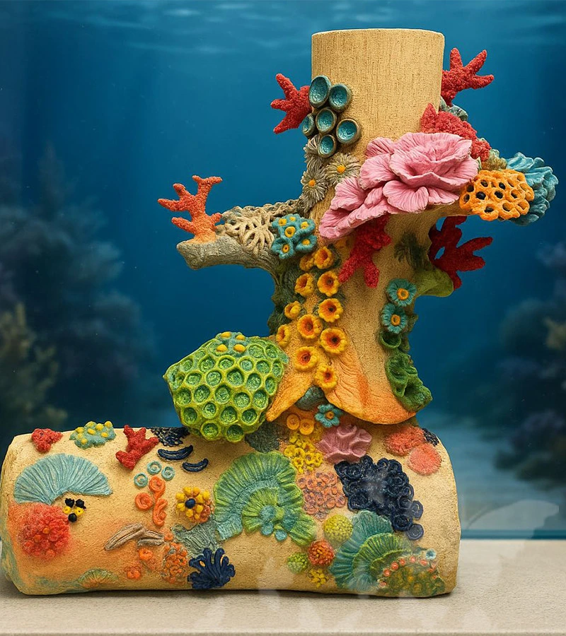Tento ručně modelovaný útes je bohatě dekorován korály a citlivě zdoben glazurami.
