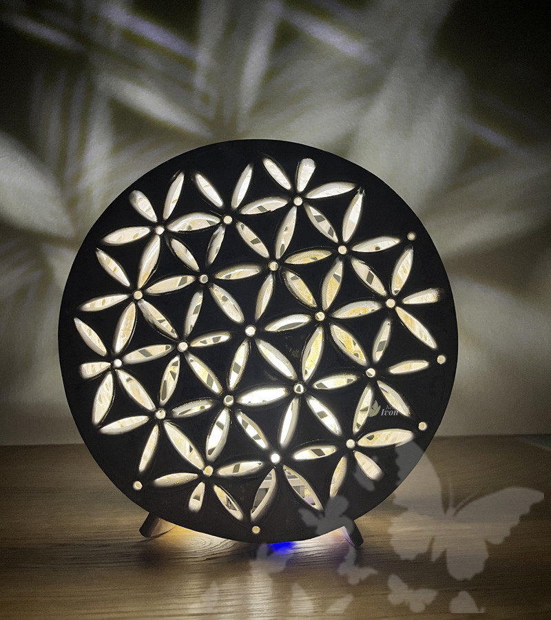 Tento symbol, tvořený překrývajícími se kruhy, je považován za jeden ze základních stavebních bloků vesmíru a symbolizuje propojení všeho živého, jednotu a dokonalost. Přítomnost tohoto symbolu v lampě může přinést do vašeho prostoru pocit klidu, rovnováhy a duchovní pohody.