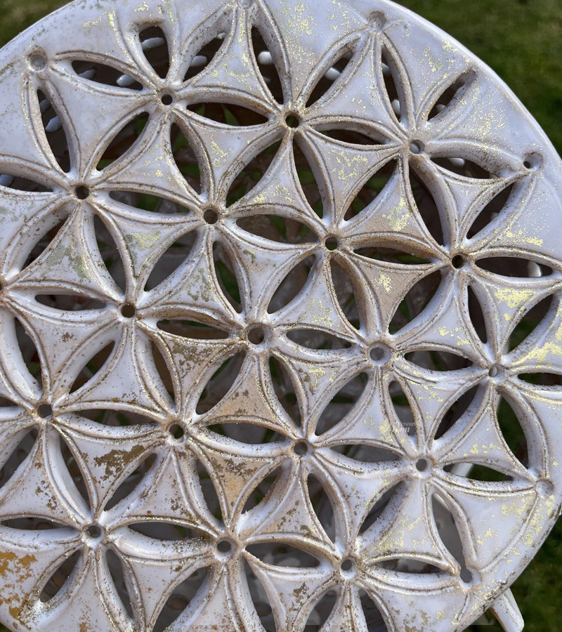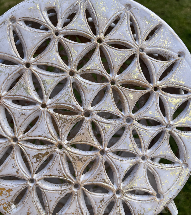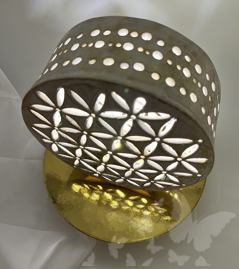 Lampa je zdobena elegantní bílou lazurou, která jí dodává sofistikovaný a čistý vzhled. Celkový dojem umocňuje jemný zlatý třpyt, který se snoubí s bílou a vytváří efekt starobylého zlata nebo mystického lesku. Tento třpyt dodává lampě luxusní nádech a způsobuje, že se světlo odráží fascinujícím způsobem.