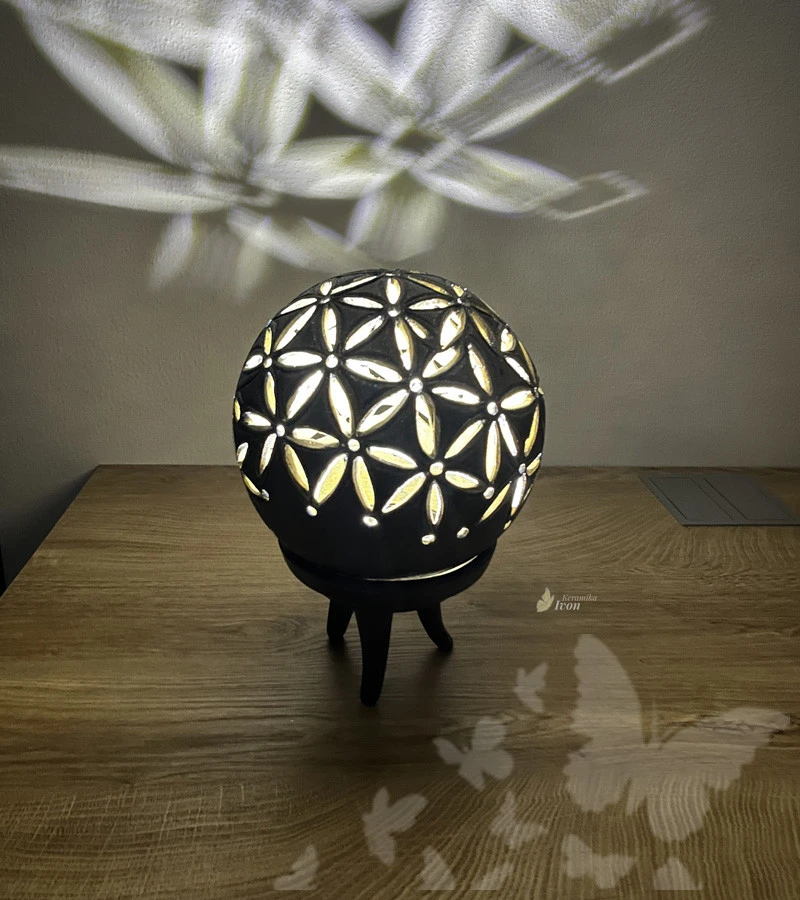 Lampička je ze dvou částí, horní tvoří kouličku s květem Života a spodní část je podstavec .