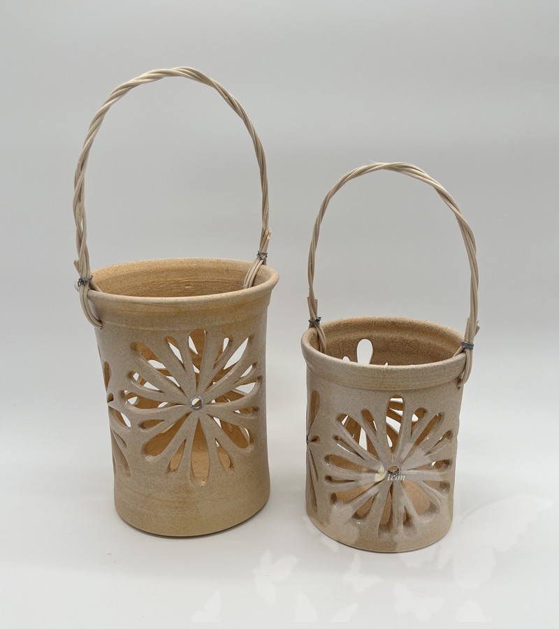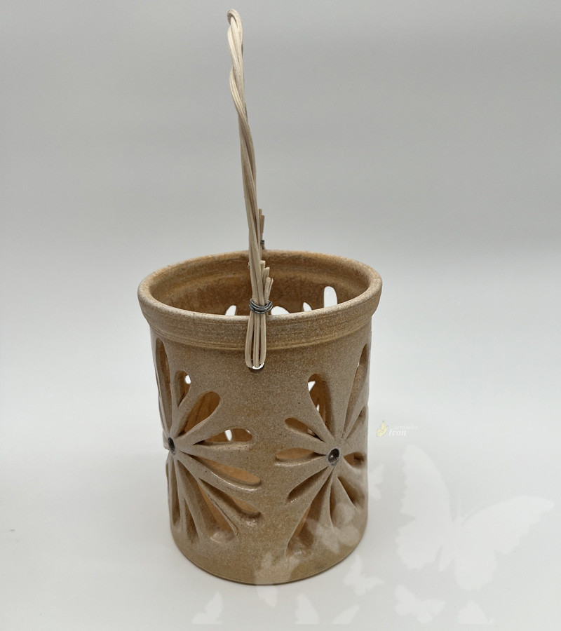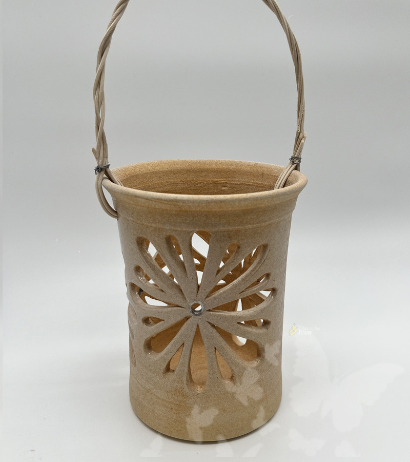 Tělo lucerny je vyrobeno z kvalitní keramiky v příjemných zemitých tónech. Zvláštností jsou precizně vyřezávané květinové motivy, které umožňují světlu svíčky pronikat ven a vytvářet okouzlující hru stínů a světelných paprsků na okolních stěnách. Tyto květinové vzory dodávají lucerně romantický a vzdušný vzhled.