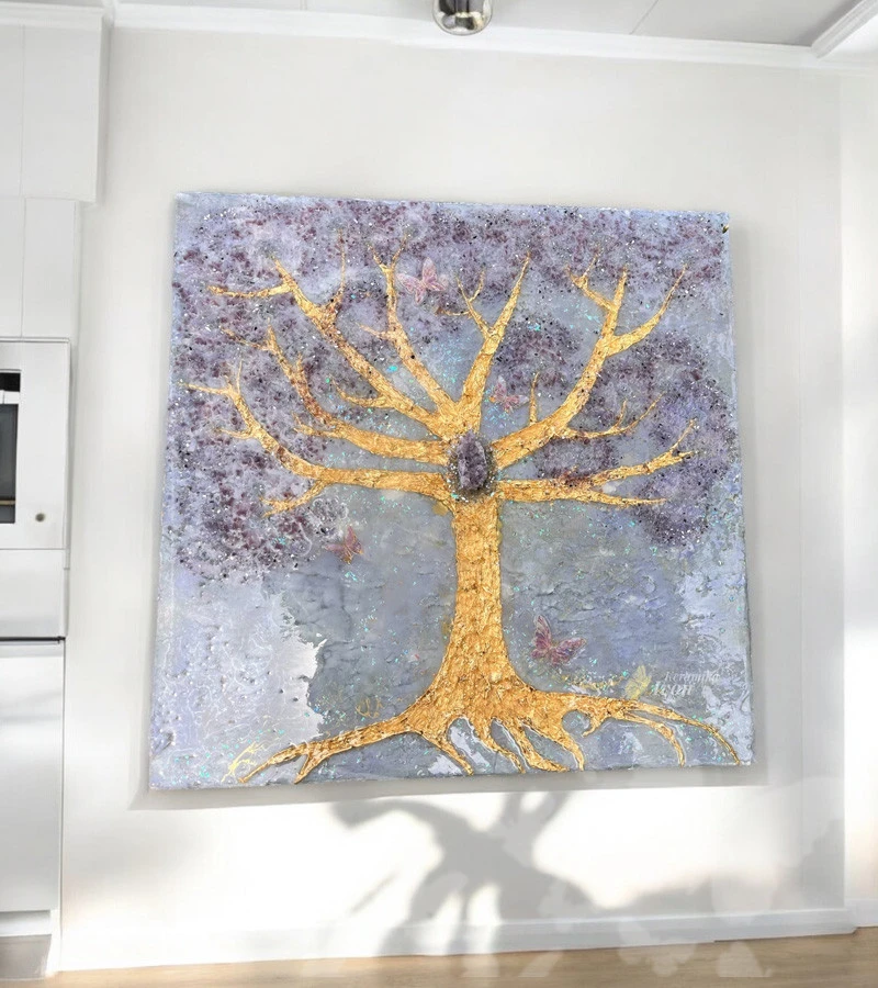 Ametyst, který je vložen téměř do středu koruny stromu podporuje ochranu, čistí prostor, podporuje intuici,zmírňuje bolest hlavy a uvolňuje napětí .