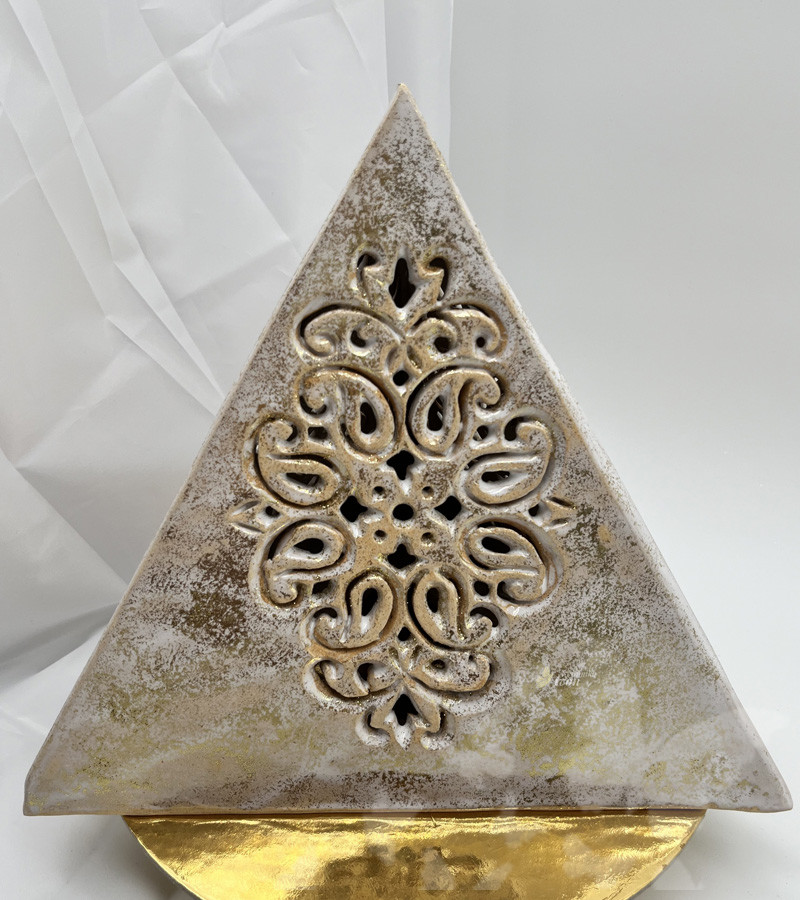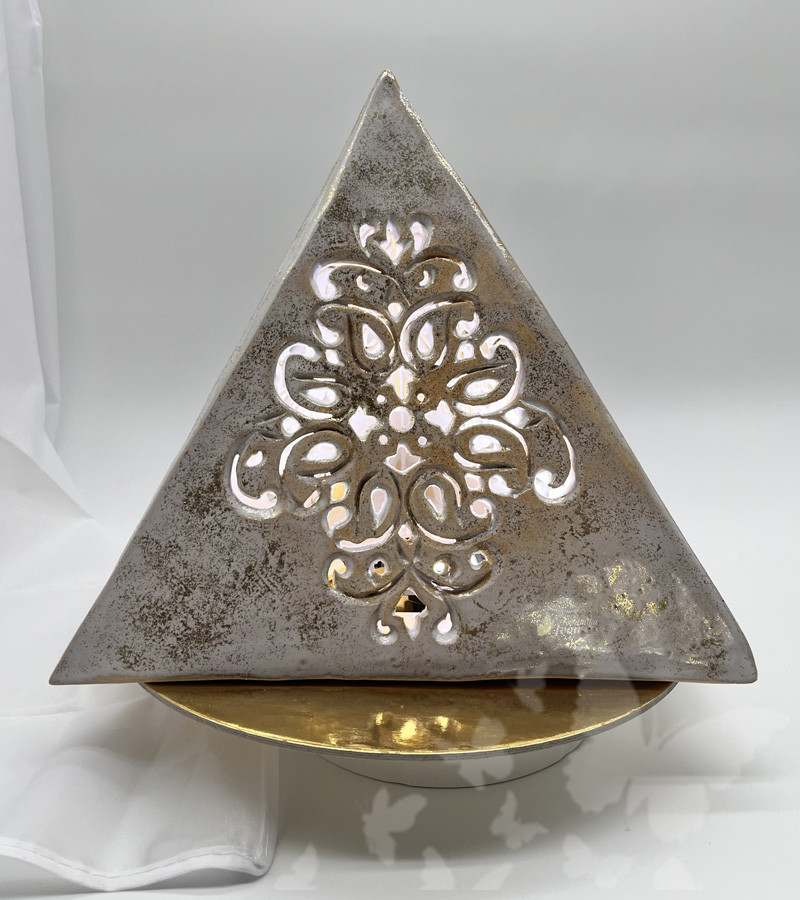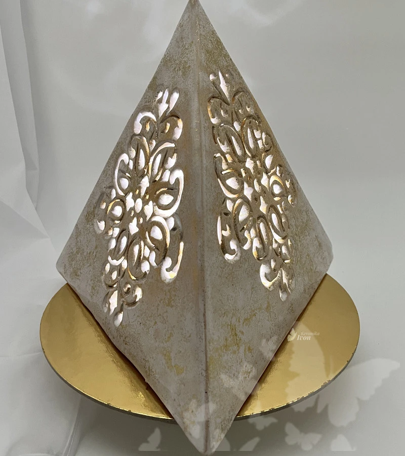 Pyramida je bílé barvy se zlatou patynou, která podporuje světelnou zář.