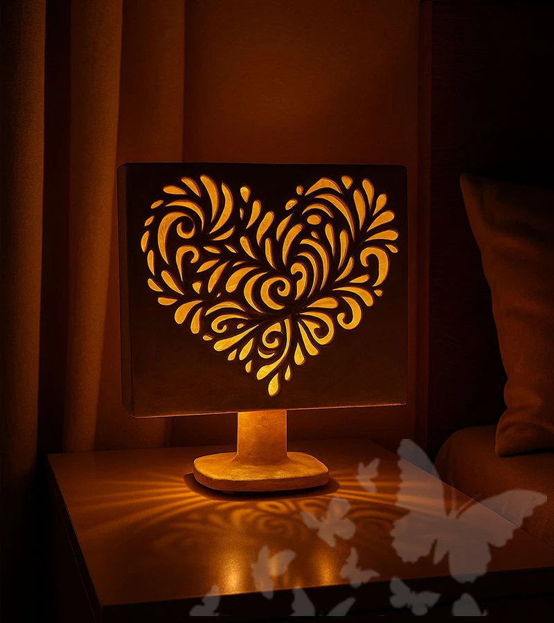 Precizně vyřezávaný vzor srdce tvoří jemné světelné obrazce na stěnách i nábytku, čímž vytváří kouzelnou atmosféru klidu a lásky.