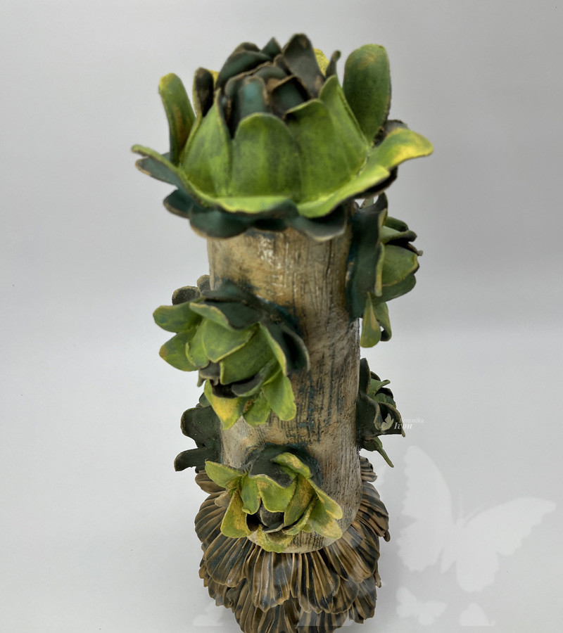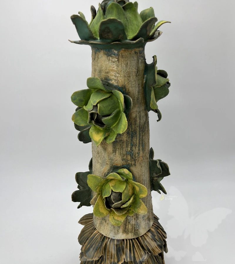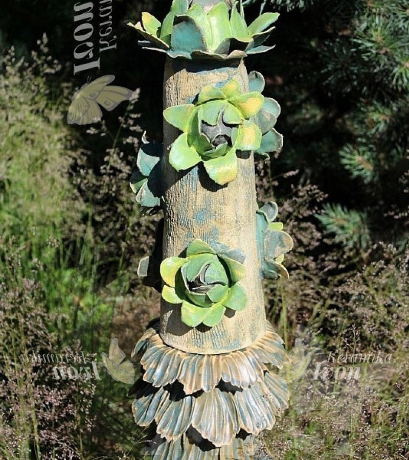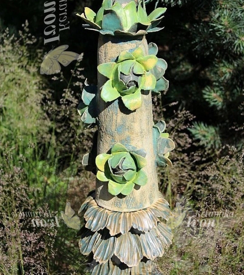 Keramická květinová dekorace v zelenkavé barvě pro celoroční pobyt v zahradě.